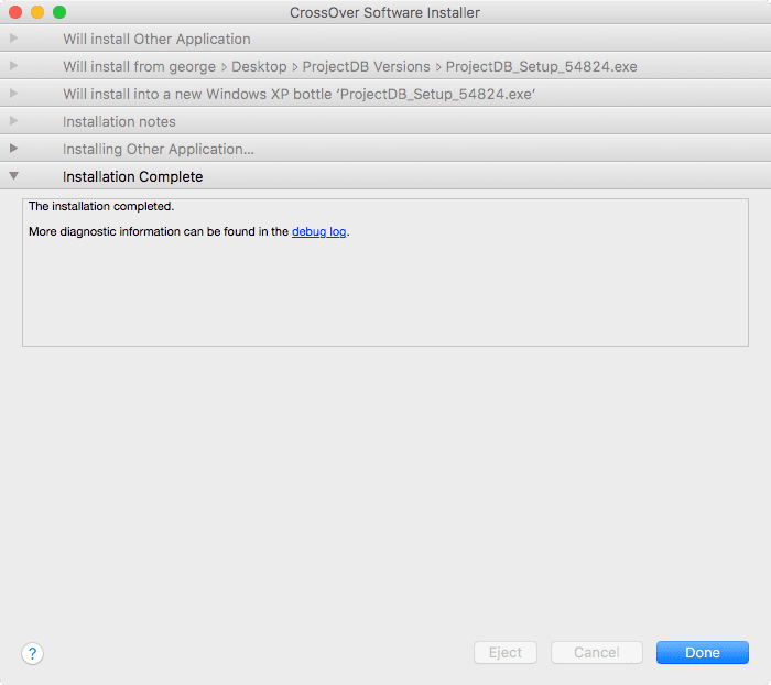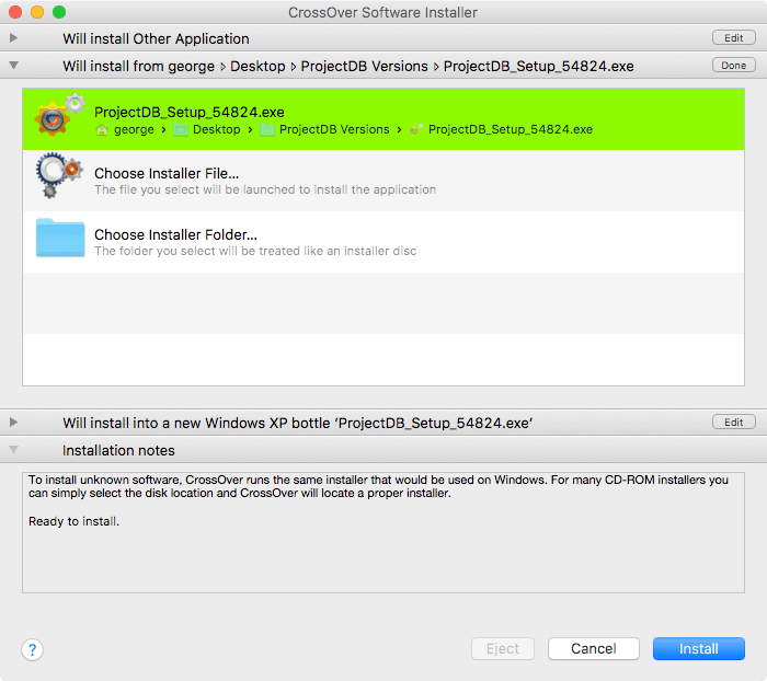 At the moment ProjectDB can be used on the Microsoft Windows operation systems, as well as on OS X and Linux with the help of emulator for Windows, such as, CrossOver software by Codeweavers.