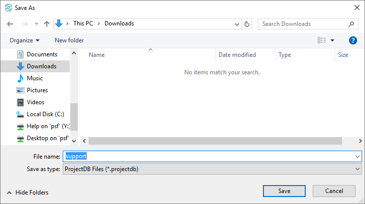 1.6.1.9. Click Save - in the specified location file support.projectdb appears.