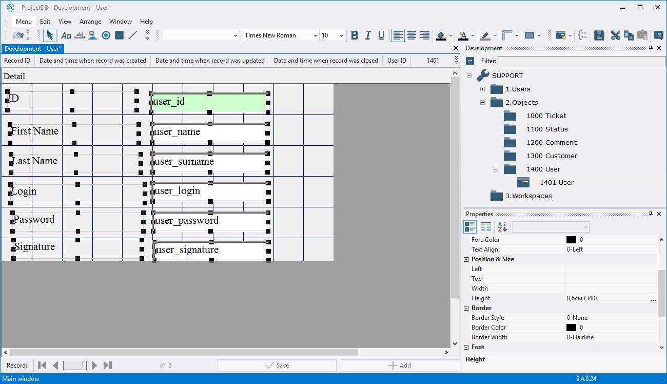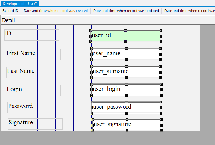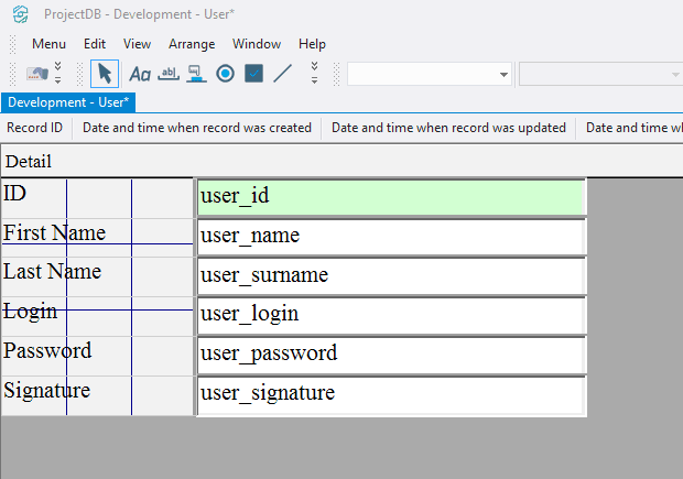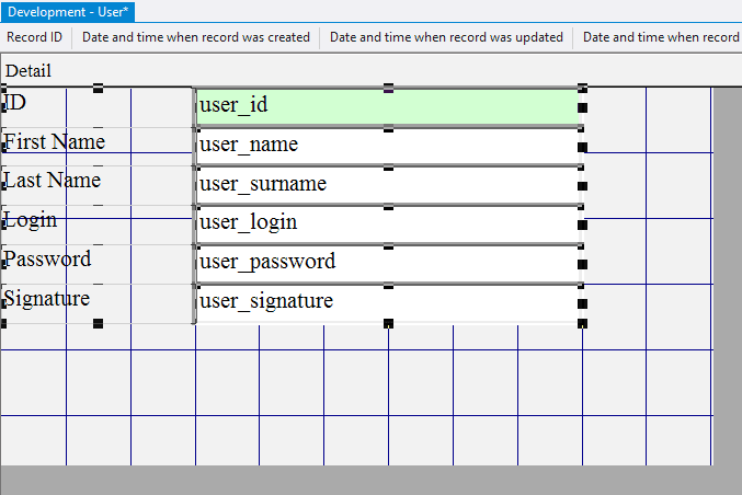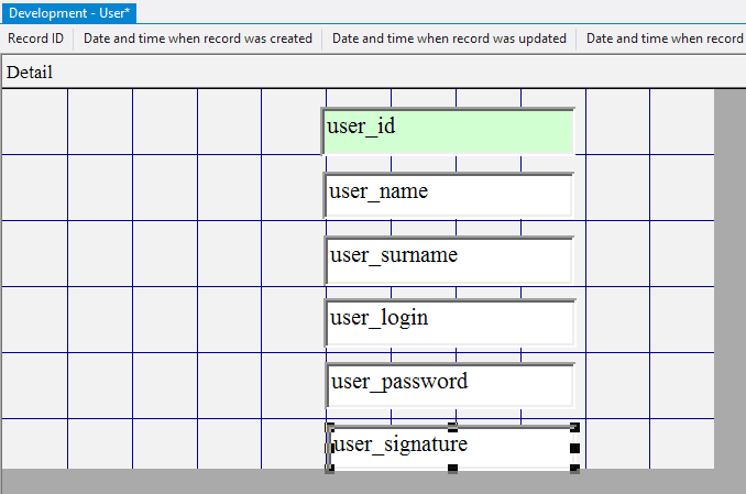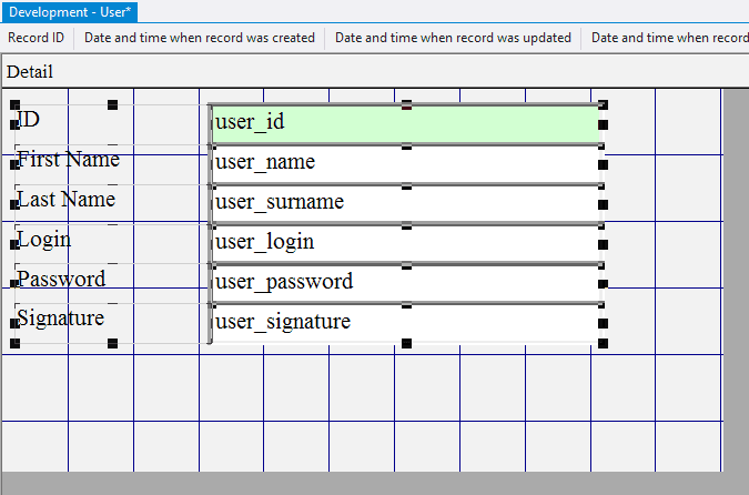 2.5.3.11. In the field Control Source for each of the added fields, choose accordingly user_name, user_surname, user_login, user_password, user_signature;