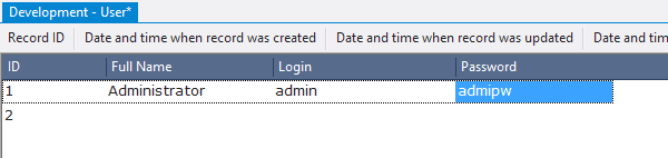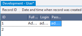 2.5.2.6. Select each column by clicking the left mouse button on any line of the table, specify in the field Caption the displayed name of the column - ID, Fullname, Login, Password accordingly;