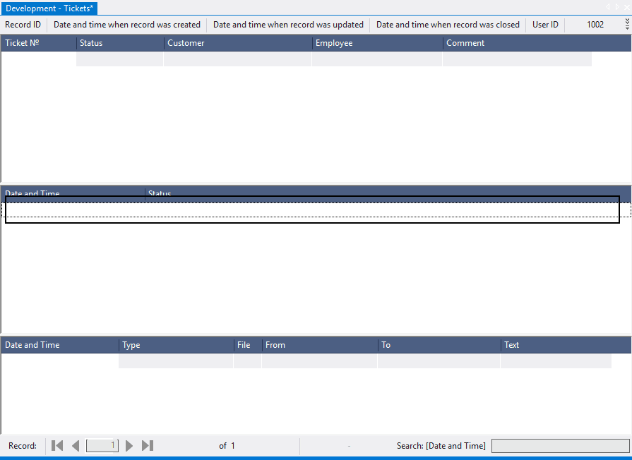 The main object to work with tickets is 1002 Tickets, that consists of the tables 1001 Tickets (base), 1102 Status (base), 1202 Comment (base). Object 1002 Tickets allows you to view not only information about tickets, but also to track the history of changes in statuses and comments.