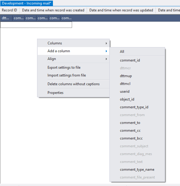 9.2.2.4. Open the context menu by right-clicking in the empty space of the object, choose Add a column and select columns dttmcr (comment creation date and time), comment_from (message sender), comment_subject (message subject), comment_file_present (attached file), comment_text (comment text), comment_diag_mes (diagnostic message generated when analyzing the subject of the message);