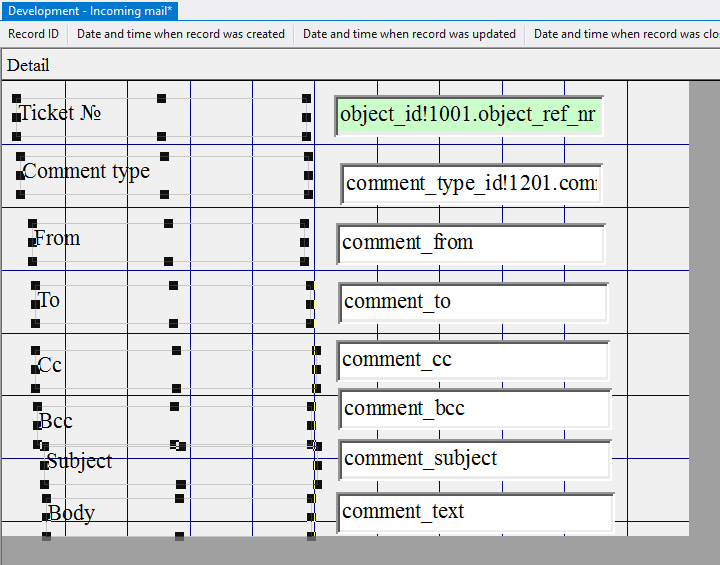 9.2.3.3. In system fields Record ID, Date & Time (Created), Date & Time (Updated), Date & Time (Closed), User ID choose fields from the table - comment_id, dttmcr, dttmup, dttmcl, userid;
