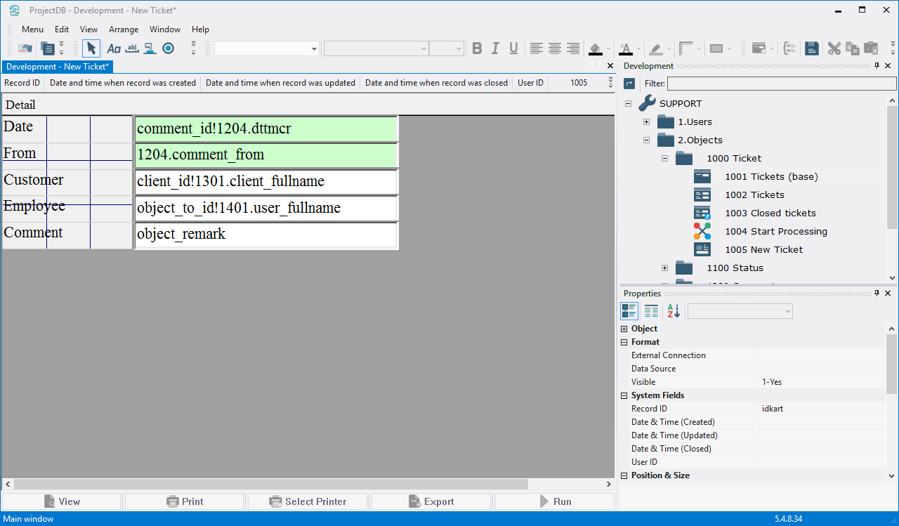 9.5.1.3. In the Properties window, in the Object Code field enter 1005, in the Object Name field enter New Ticket;