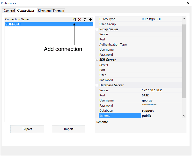 1.5.1.10. In the field Database of the section Database Server type in support;