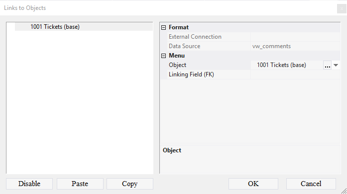 The entry selected in table 1001 Tickets (base) defines records displayed in tables 1102 Status (base) and 1202 Comment (base). For this, links between the tables should be created.
