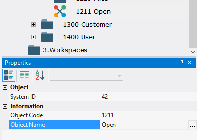 8.3.1.3. In the Properties window, enter 1211 in the Object Code field, enter Open in the Object Name field;