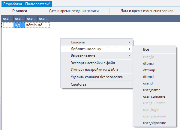 2.5.2.5. вызвать контекстное меню нажатием правой кнопки мыши в пустом пространстве объекта, выбрать Добавить колонку и отметить колонки user_id, user_fullname, user_login, user_password;