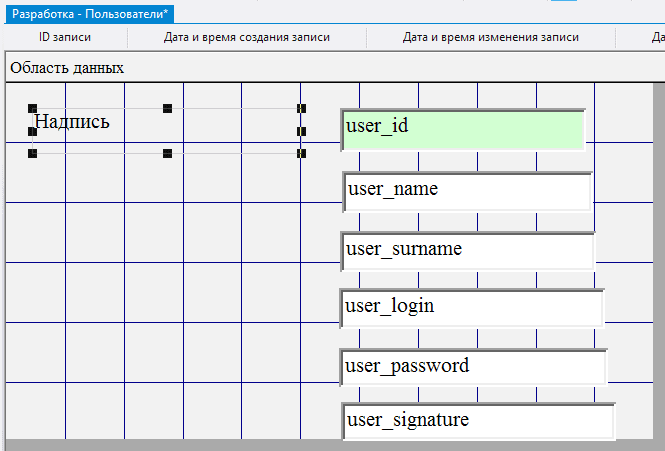 2.5.3.14. нажать левую кнопку мыши и, не отпуская ее, очертить размеры надписи таким образом, чтобы надпись оказалась слева от поля user_id;