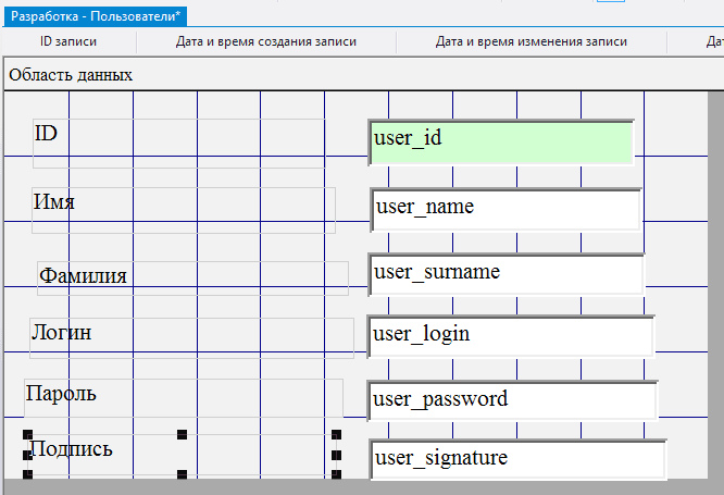 2.5.3.11. в поле Данные для каждого из добавленных полей выбрать соответственно user_name, user_surname, user_login, user_password, user_signature;