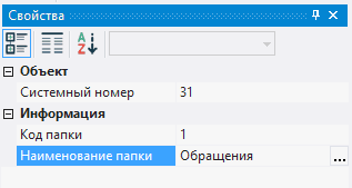 6.5.1.5. в окне Свойства в поле Код папки ввести 1, в поле Наименование пакпи ввести Обращения;