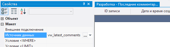 7.3.2.2. в поле Источник данных указать объект базы данных, данные из которого будут отображаться - представление vw_latest_comments;