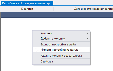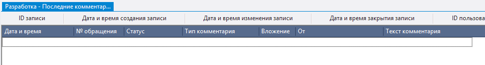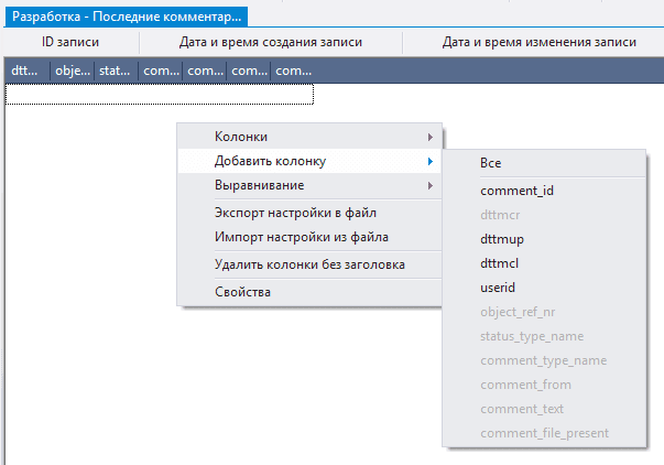 7.3.2.4. вызвать контекстное меню нажатием правой кнопки мыши в пустом пространстве объекта, выбрать Добавить колонку и отметить колонки dttmcr (дата и время создания комментария), object_ref_nr (№ обращения), status_type_name (текущий статус обращения), comment_type_name (тип комментария), comment_file_present (вложение), comment_from (от), comment_text (текст комментария);