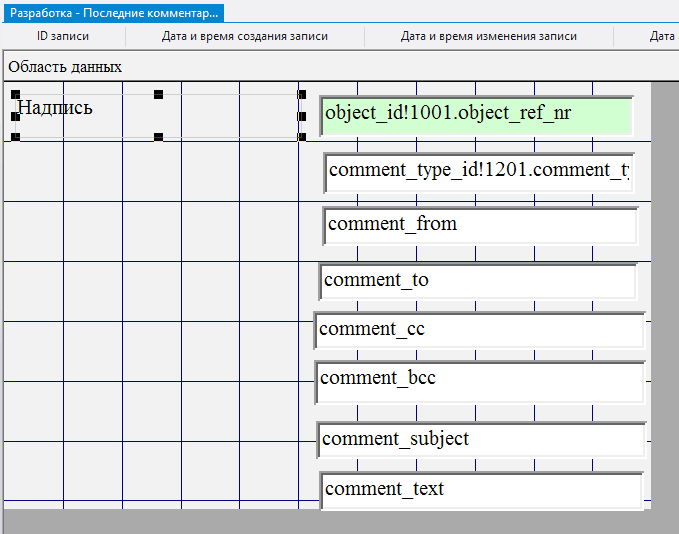 7.3.3.23. в поле Подпись каждой из надписей ввести соответственно Тип комментария, От, Кому, Копия, Скрытая копия, Тема, Текст;