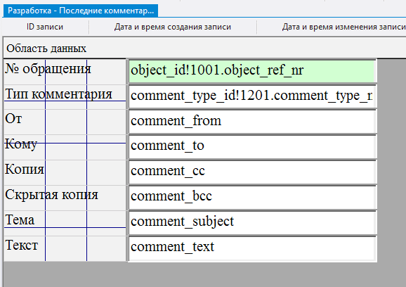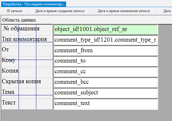 7.3.2.3. в cистемных полях ID записи, Дата и время создания, Дата и время обновления, Дата и время закрытия, ID пользователя выбрать поля - comment_id, dttmcr, dttmup, dttmcl, userid соответственно;