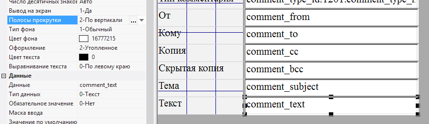 7.3.3.35. выделить поле comment_text - данное поле будет занимать оставшееся свободное место при работе в форме и хранить многострочный текст, поэтому следует разрешить прокрутку текста по вертикали, установив в поле Полосы прокрутки значение 2-По вертикали;