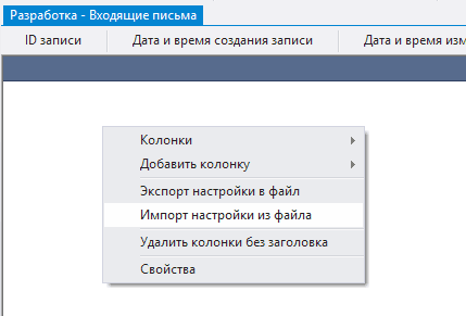 9.2.2.4. вызвать контекстное меню нажатием правой кнопки мыши в пустом пространстве объекта, выбрать Добавить колонку и отметить колонки dttmcr (дата и время создания комментария), comment_from (отправитель письма), comment_subject (тема письма), comment_file_present (наличие вложенного файла), comment_text (текст комментария), comment_diag_mes (диагностическое сообщение, формируемое при анализе темы письма во время загрузки);